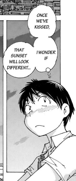 That’s not to say there aren’t chapters purely comprised of innocent fun or tender/touching chapters (hell, a few chapters made my eyes brim with tears), but the curiosities of an adolescent male are truthfully only so diverse when it comes to adolescent females. Therefor chapters dedicated to Tsubaki’s fixation on how Urabe would look in certain costumes — a bathing suit, bunny ears, a Guy Fawkes mask — play a large role in filling volumes. Thankfully, the costumes are more a means to expose Tsubaki’s shallowness and how it (however unintentionally) negatively affects the relationship between Urabe and himself. In short, moments of anger, jealousy, and objectification, as reflected by Urabe’s sincere hurt conveyed via the seemingly magical emotional transferrence of drool, cause the couple to learn more about themselves and each other and behave differently thereafter. That is to say they grow … together; nothing is ever portrayed as one-sided in this manga. Rather, that’s as it would be in a perfect world. The repetition of such chapters, while at best a possible statement on the single-mindedness of the adolescent male psyche, reveals a frustrating lack of growth in storytelling and gets just about as tiresome as waiting for Tsubaki and Urabe to actually share a real kiss.