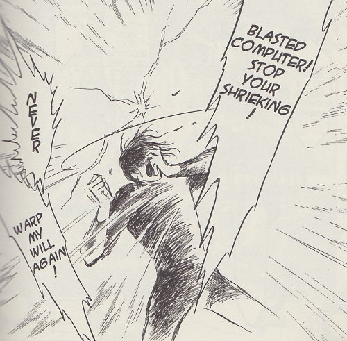On the other end of the spectrum, Sam is dead average. He squeaks passes in his exams, neither dissents or swears by the regime that produced him, and doesn’t sweat the small stuff. His main responsibility is to his friends, and sticks by Keith through thick and thin. An upstanding citizen, he graduates with average grades and takes a job as a space trucker, something that sounds even more boring than normal truck driving. Through this job he comes to meet the Mu and in particular the main protagonist Jomy, who he was childhood friends with. Faced with a filthy telepath, Sam acts upon the information that the computer education has drilled into him and freaks the hell out, attacking Jomy in a fit of primal fear. Jomy is horrified how his old friend has been warped and over-reacts, causing a massive explosion and injuring Sam.