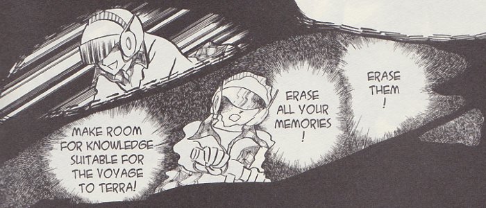 Jomy, the main protagonist of the story, also goes through the normal SD upbringing experienced by Sam and Seki, and like them he is abducted at 14 to undergo the Maturity Check. For him, however, things change when he is rescued by the leader of the Mu and made their new leader. Faced with so much responsibility and hostility from both the SD order and from his own people, it would make sense for Jomy to seek a return to the halcyon days of his youth, even while knowing that it was a fabrication. For the majority of the story he tries to bring happiness to the Mu by creating a stable home for them, free from the overbearing computerized system that hunts them.